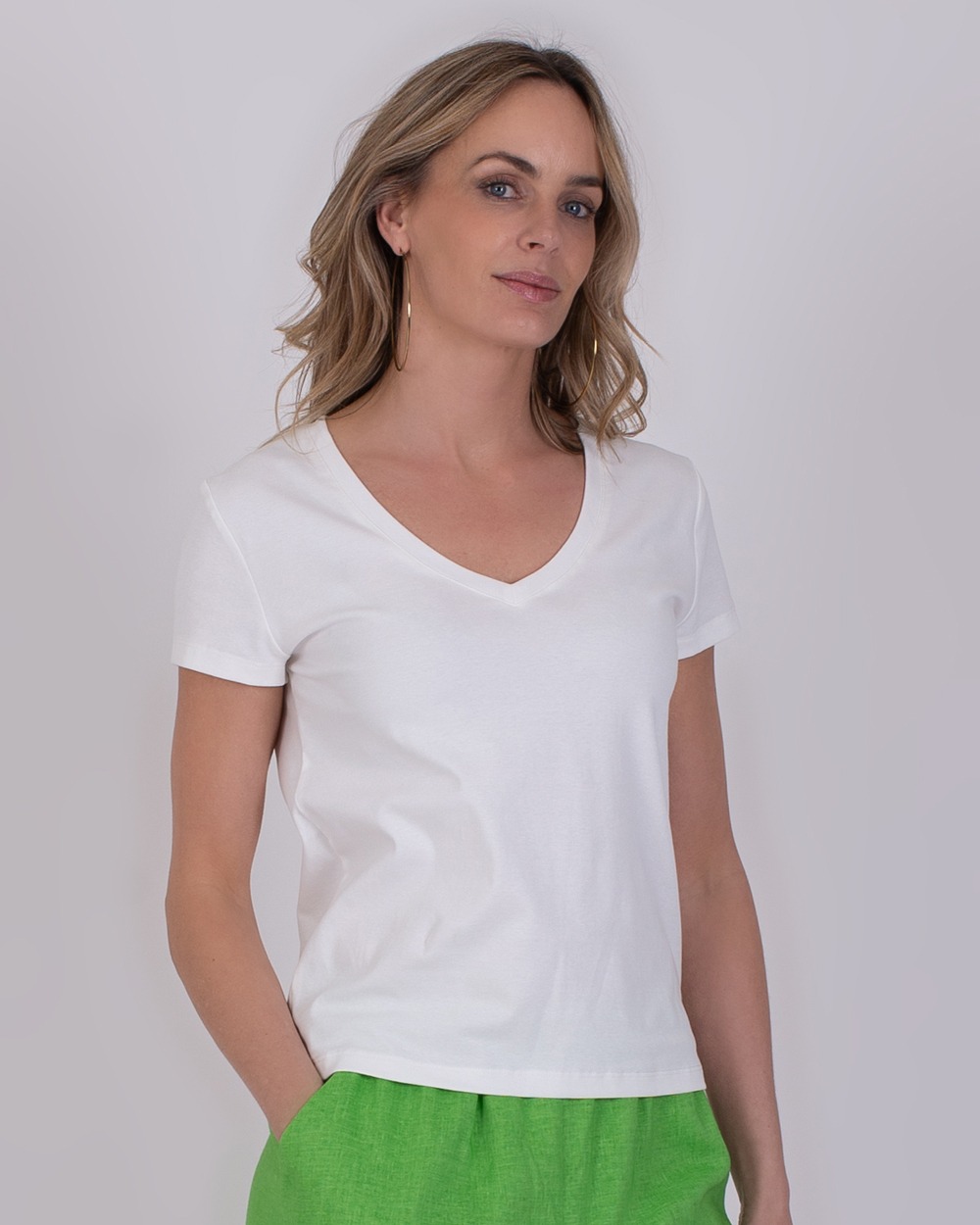 Het Berlin T-shirt met V hals is een tijdloze basic met een zachte en comfortabele feel. Gemaakt van dezelfde hoogwaardige katoen-stretch kwaliteit die licht aanvoelt op de huid en prettig meebeweegt. De korte mouwen en rechte pasvorm zorgen voor een clean, vrouwelijk silhouet dat moeiteloos te dragen is.