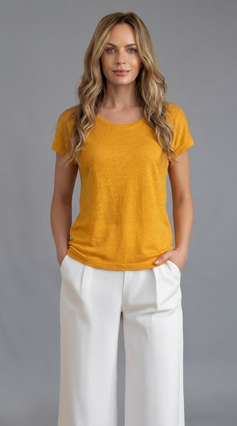 • Vrouw poseert in beige T-shirt met V-hals en opgerolde mouwen tegen een neutrale achtergrond.