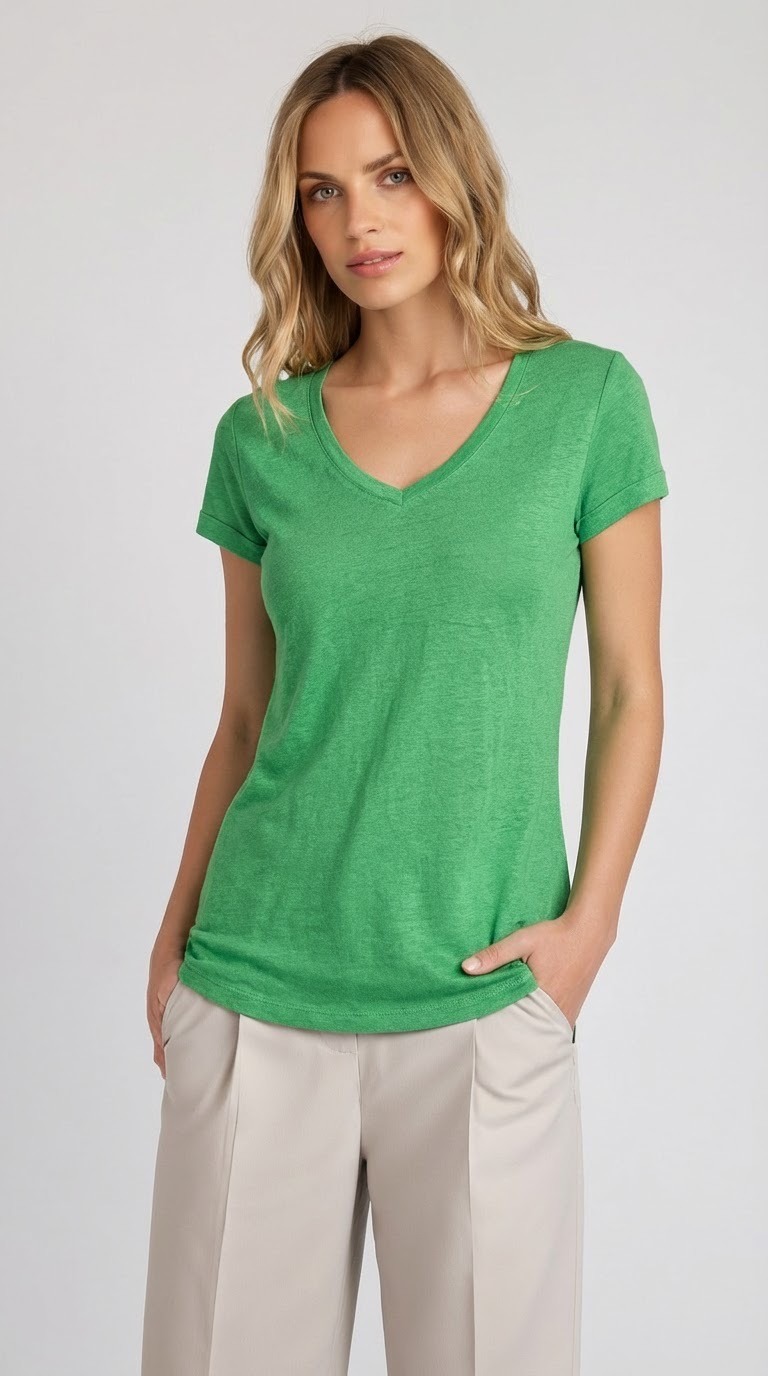 Dames t shirt sea green linnen korte mouw met V hals – ATHENE