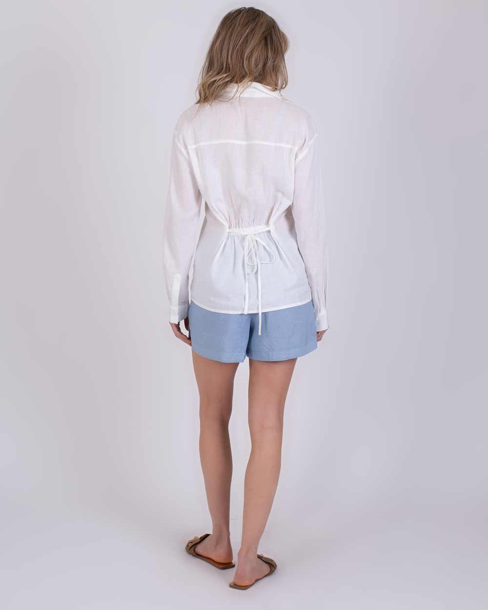 • Vrouw draagt een lichte Seoel off white blouse met lange mouwen en lichtblauwe broek.