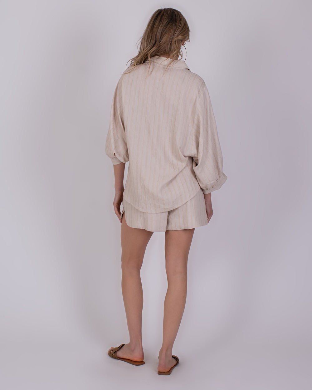 De Busan blouse heeft een frisse, tijdloze uitstraling dankzij de subtiele streep. De pasvorm valt iets ruimer dan normaal, zonder oversized te zijn, wat zorgt voor een comfortabele en moderne look.