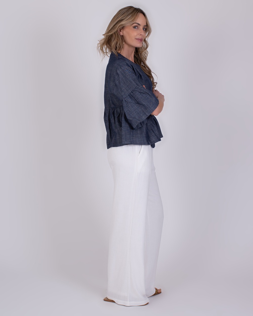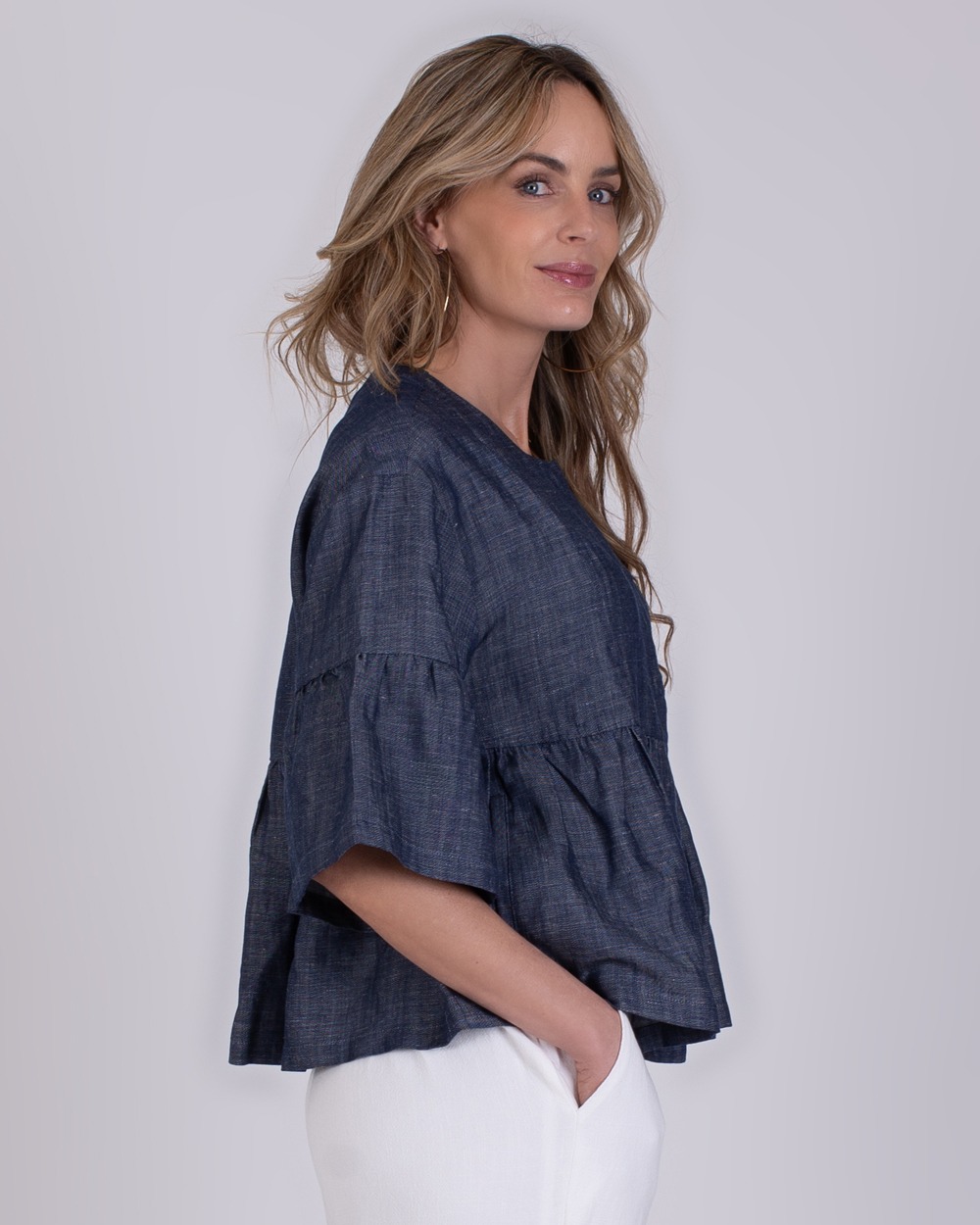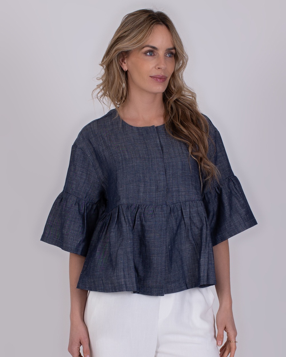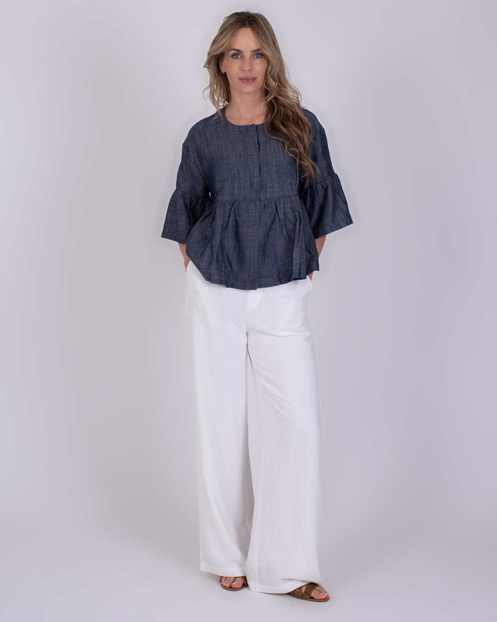 Blouse top Khost is gemaakt van een natuurlijke mix van tencel en linnen, wat zorgt voor een luchtige, zachte en comfortabele stof. De ademende kwaliteit maakt deze top perfect voor warme dagen. De speelse ruches geven een vrouwelijke en elegante touch, waardoor Khost moeiteloos past bij zowel een casual als geklede look.