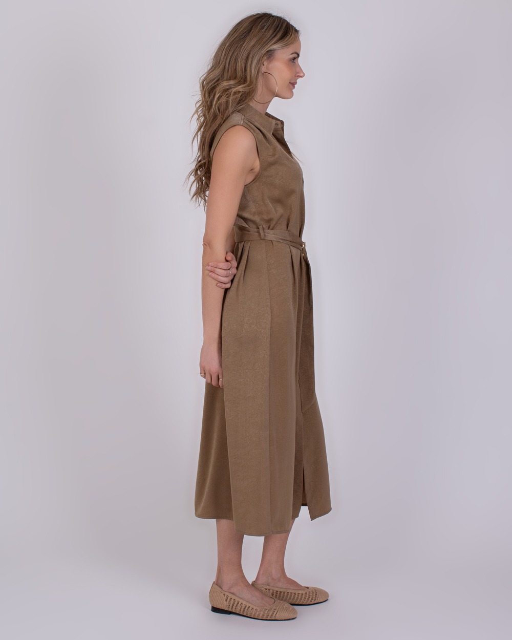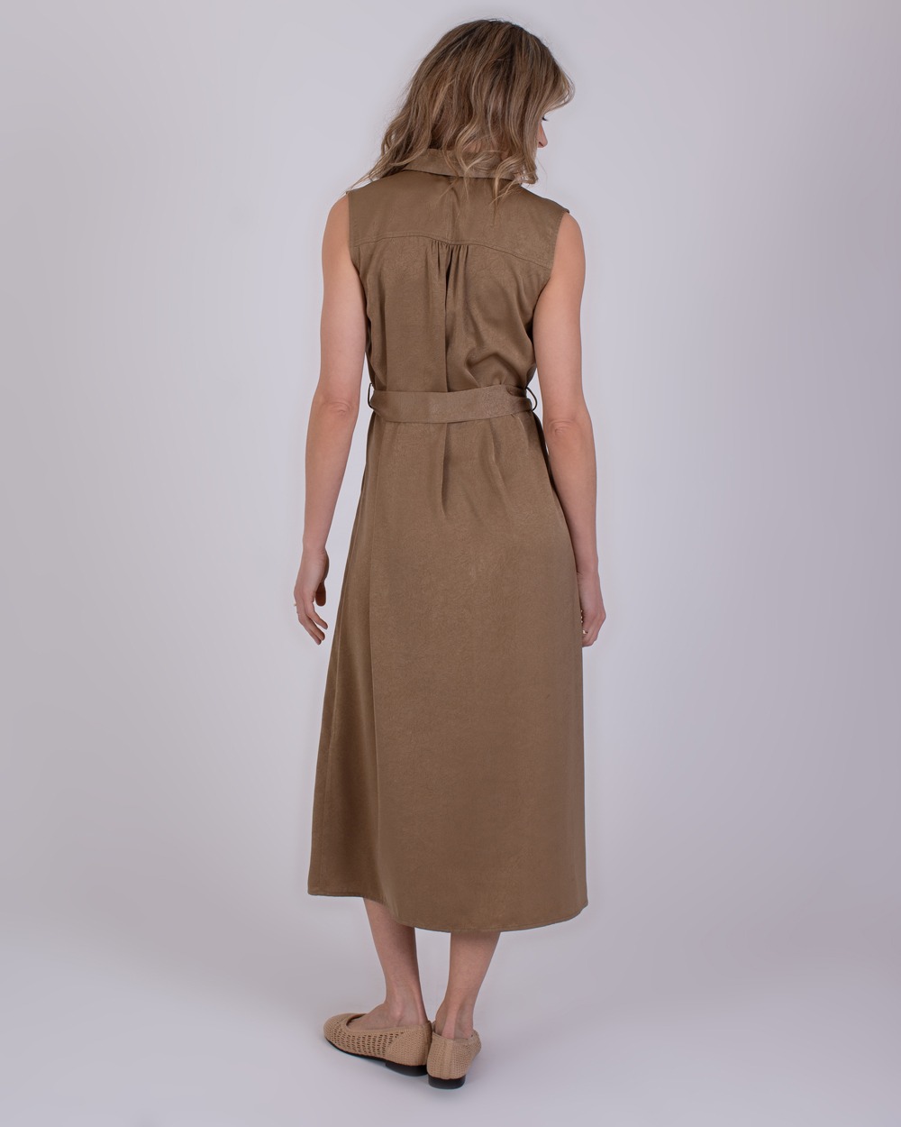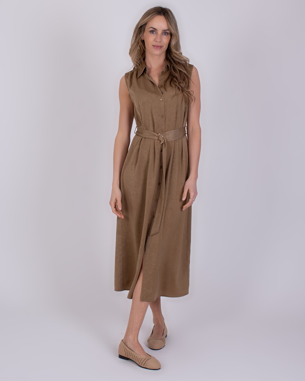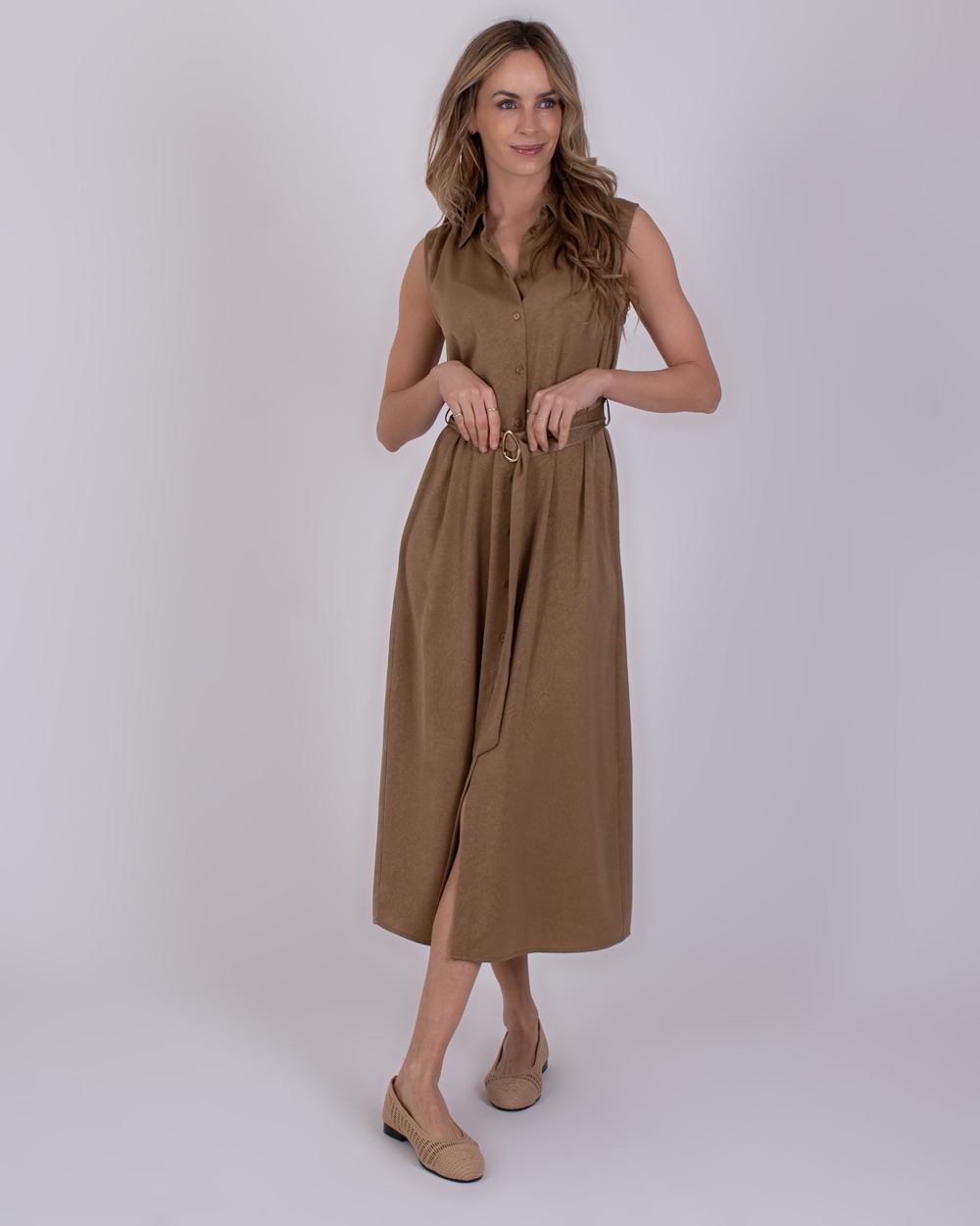 De jurk Zaria is vervaardigd uit een comfortabele mix van viscose en polyester, wat zorgt voor een zachte, soepele stof met een mooie valling. Het bijpassende riempje met een verfijnd goudkleurig detail benadrukt de taille en geeft de jurk een elegante en luxe uitstraling, perfect voor zowel een casual als geklede look.