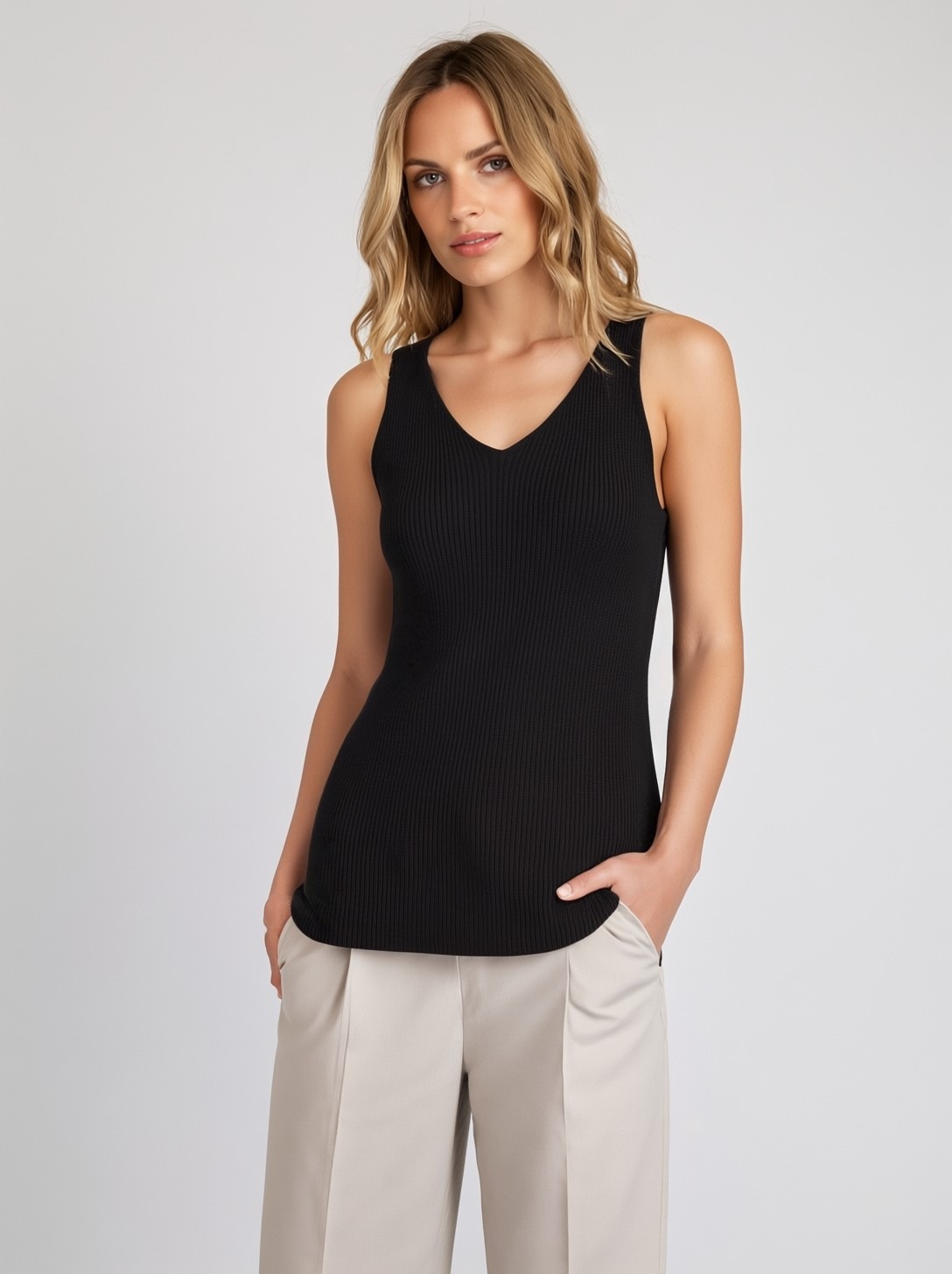 Deze gebreide mouwloze top is een comfortabel en stijlvol item met een moderne uitstraling. Het ontwerp zonder mouwen zorgt voor een luchtig en vrij draaggevoel, terwijl de bredere schouderlijn de top een verfijnde en tijdloze look geeft.