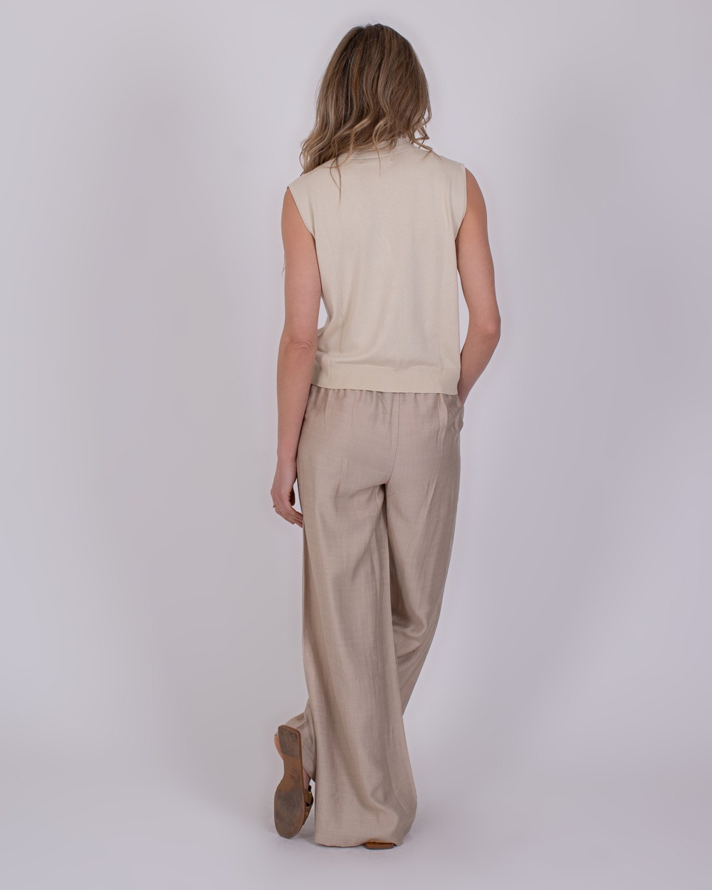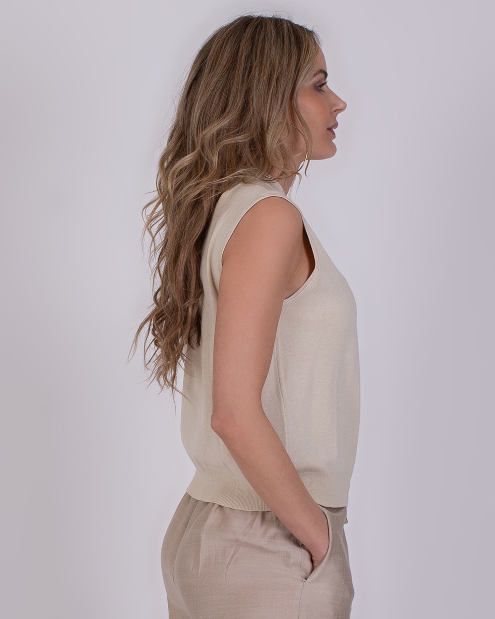 • Vrouw draagt een mouwloze off-white Valdris top met knoopsluiting en V-hals.