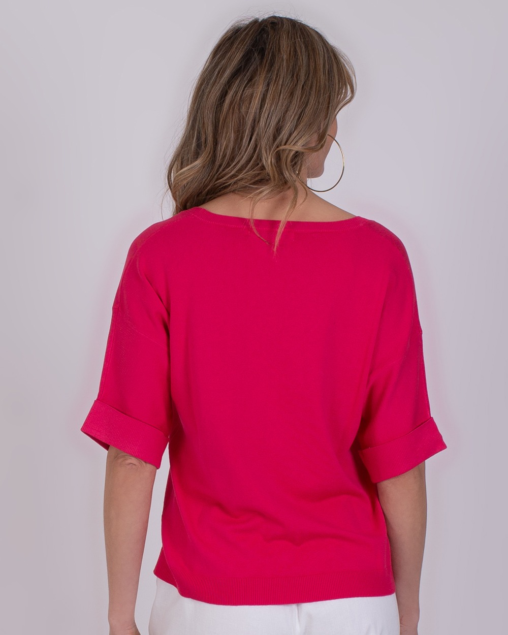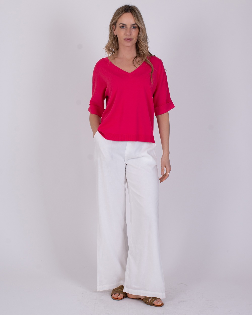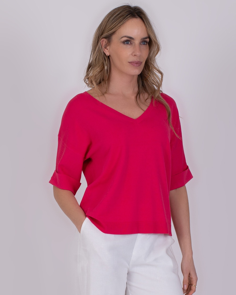 • Vrouw draagt een fuchsiaroze Pylos-top met V-hals en opgerolde mouwen, gecombineerd met een witte broek.
