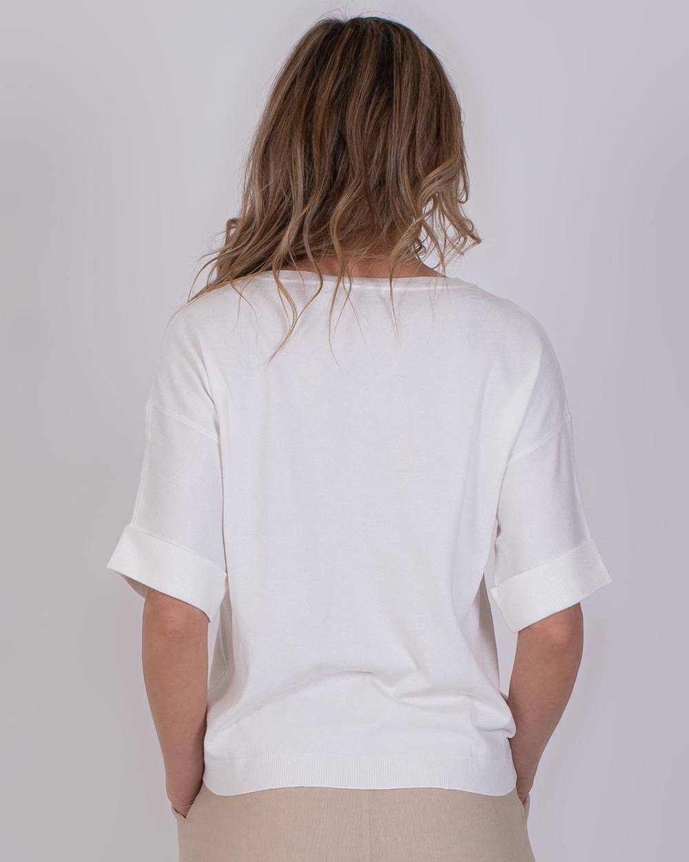 Het PYLOS T-shirt is een elegant en comfortabel item met een vrouwelijke uitstraling. Gemaakt van zachte viscose voelt het shirt soepel en licht aan op de huid en valt het mooi langs het lichaam. De V-hals geeft het T-shirt een verfijnde touch, terwijl de omslagmouwen zorgen voor een speels detail en de mouwlengte verlengen tot een flatterende driekwartmouw.