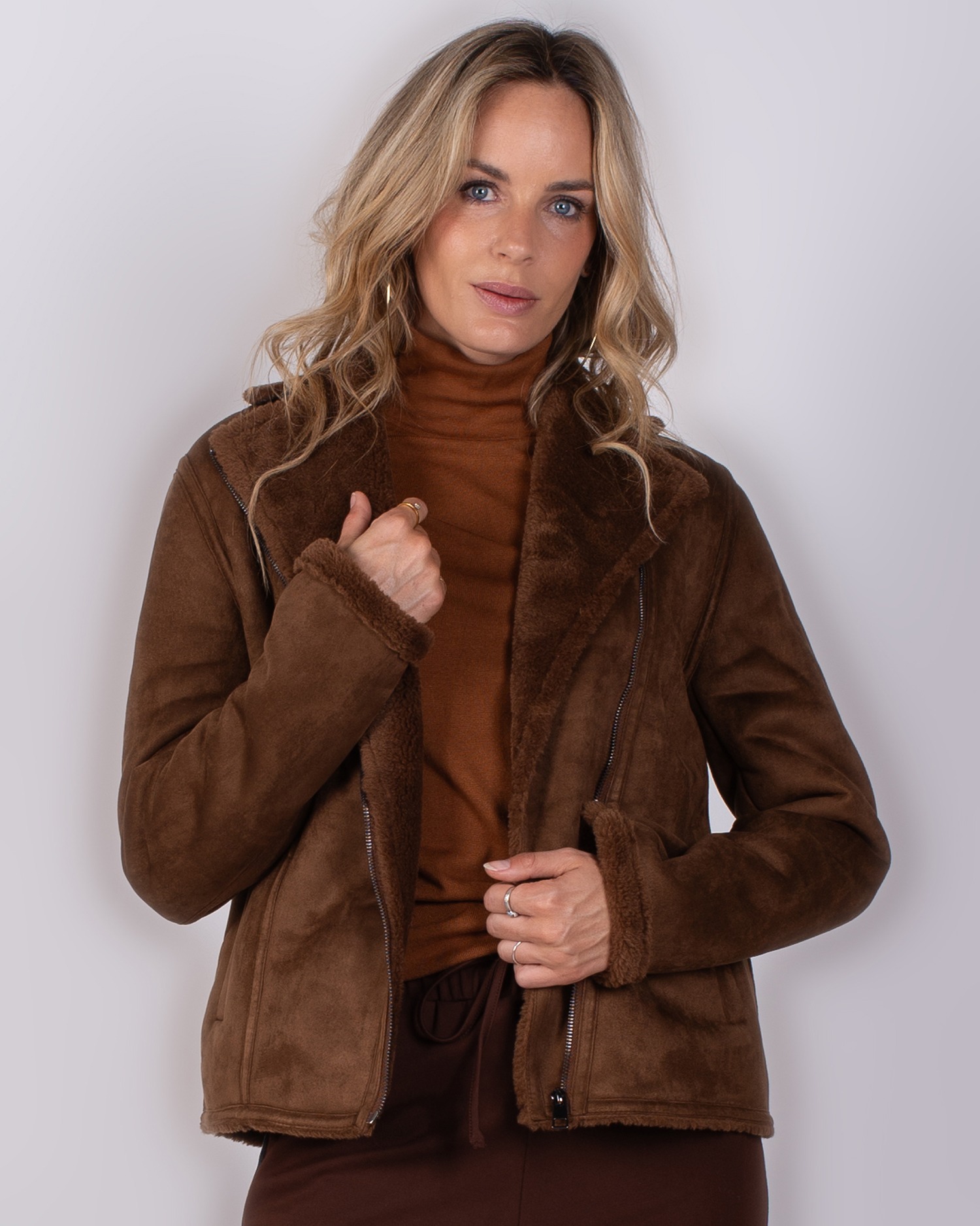 De Juno coat is een kort model lammy coat, uitgevoerd in vegan leather en afgewerkt met zachte schapenvacht. Het ontwerp combineert een stoere, moderne uitstraling met een verfijnde, luxueuze feel. Door de korte lengte krijgt de jas een eigentijdse en veelzijdige look die perfect aansluit bij zowel casual als meer geklede outfits. De rijke textuur en het comfortabele draaggevoel maken Juno tot een stijlvol statement piece dat warmte, stijl en bewuste keuzes samenbrengt.