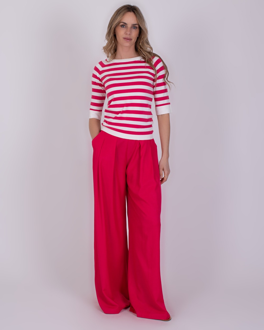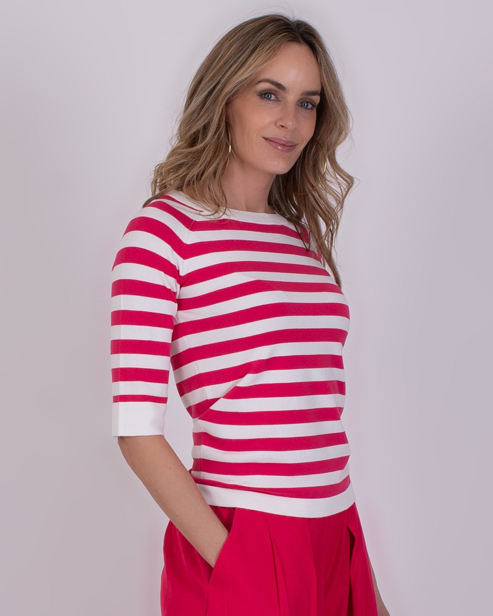 • Vrouw met halflang blond haar draagt een Moscow trui met fuchsia-witte strepen en fuchsia broek.