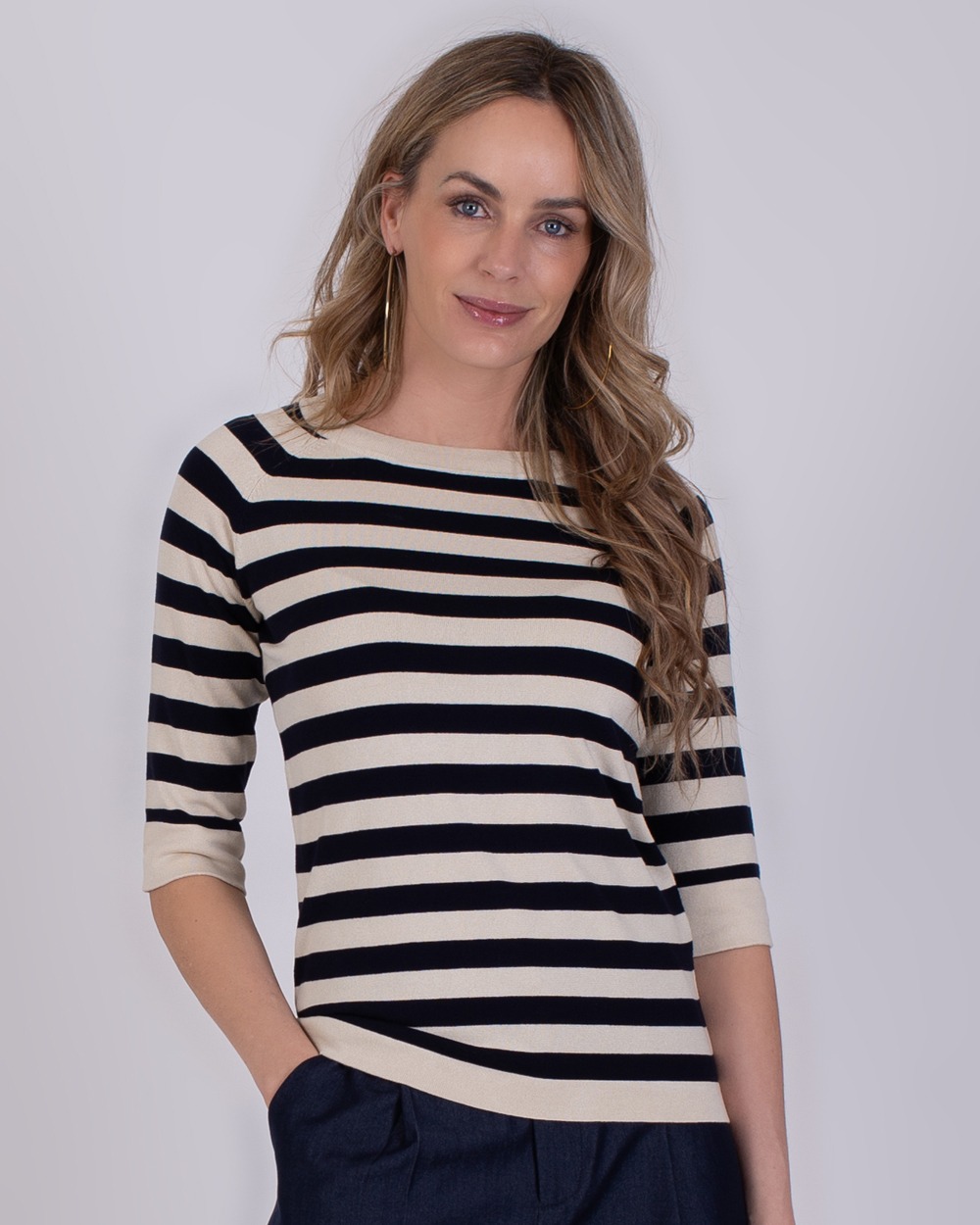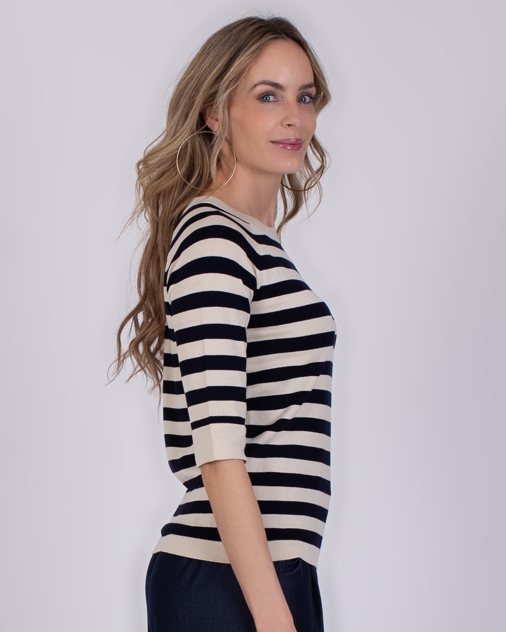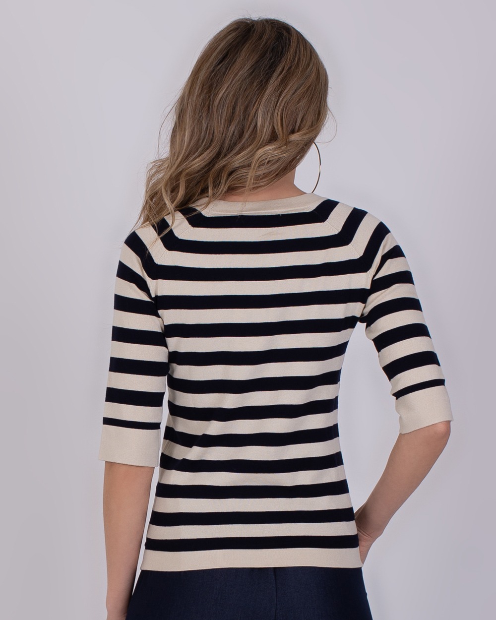 Ga voor een verfijnd silhouet met deze ultra vrouwelijke trui, gemaakt van een hoogwaardige viscose-nylon blend, voelt deze trui heerlijk zacht aan en behoudt hij zijn vorm, zelfs na veelvuldig dragen. Het model is elegant aangesneden, met een halflange mouw tot aan de elleboog, wat zorgt voor een verfijnde en moderne uitstraling.