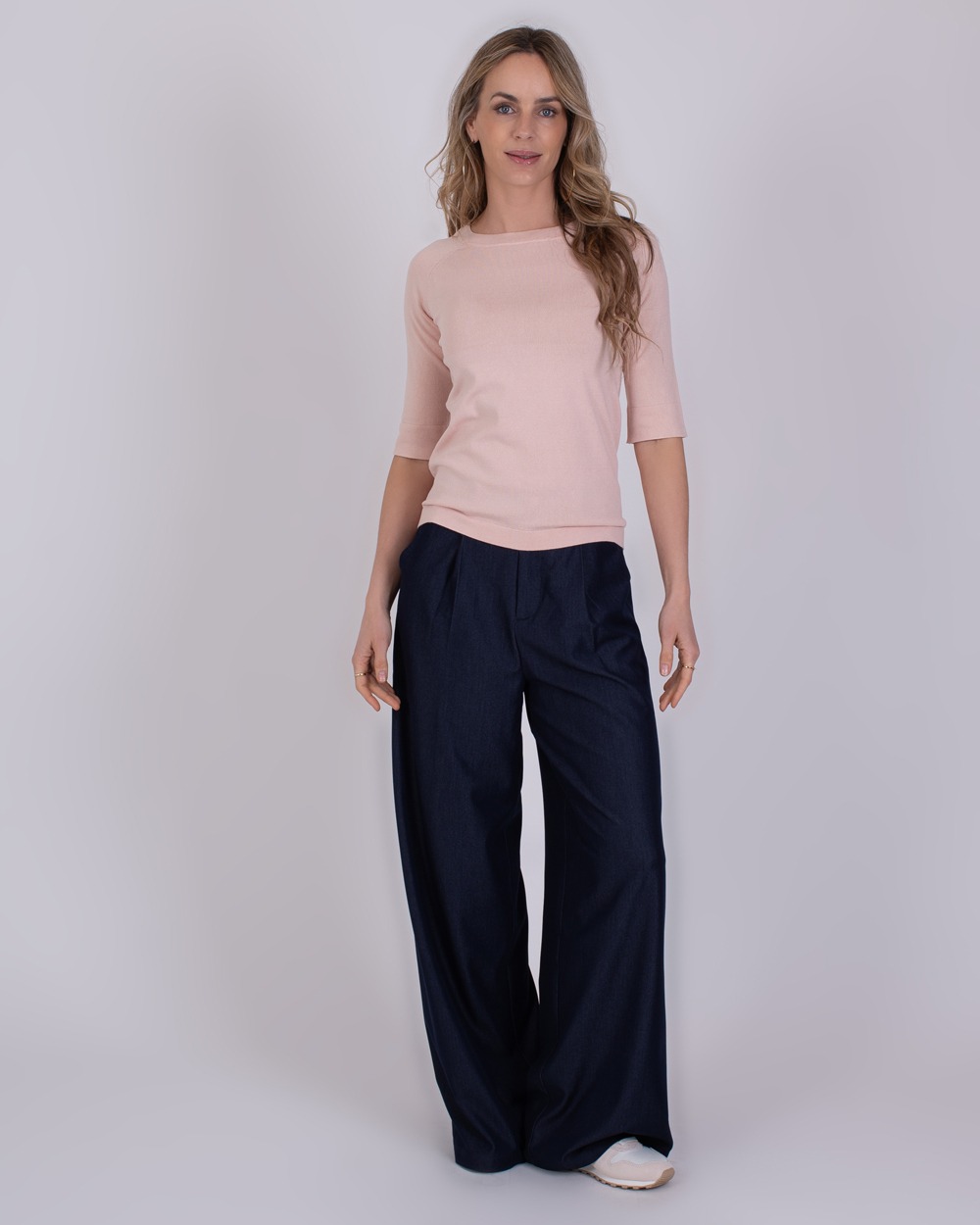 • Vrouw poseert in studio terwijl ze een donkerblauwe top en witte broek uit de SS24-collectie draagt.