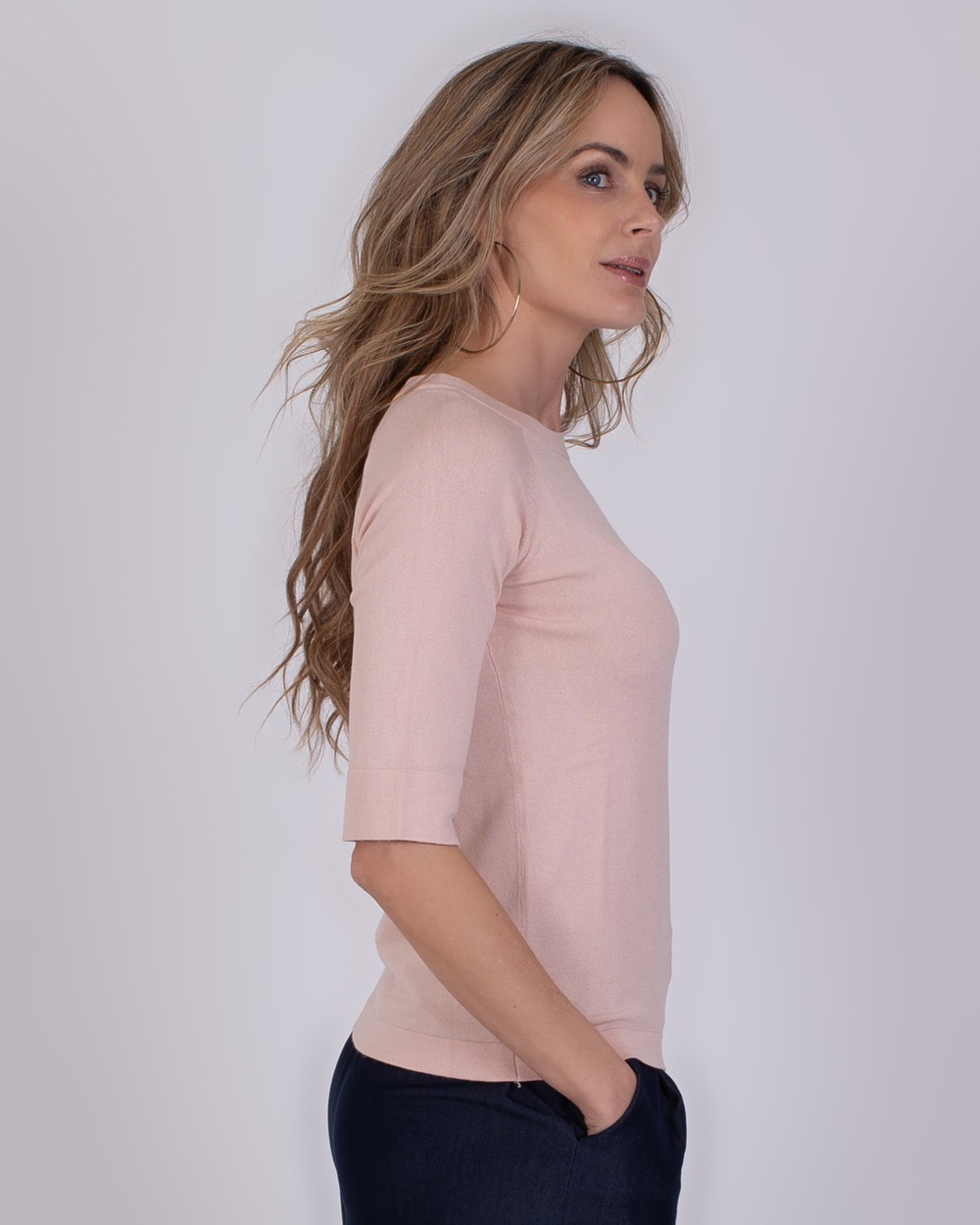 • Vrouw draagt een lichtroze trui met driekwartsmouwen uit de Moscow old pink collectie.